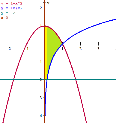 $$\begin{align}&A=\int_0^{e^{-2}}(1-x^2-(-2))dx+\int_{e^{-2}}^1(1-x^2-lnx)dx=\\&\\&\int_0^{e^{-2}}(3-x^2)dx+\int_{e^{-2}}^1(1-x^2-lnx)dx=\\&\\&\text{hago aparte la integral de ln x, lo demás es inmediato}\\&\\&\int ln\,dx=\\&u=ln\,x\qquad du=\frac{dx}{x}\\&v=dx\qquad\;\;\; v=x\\&=x\,ln\,x-\int dx = x\,ln\,x-x\\&\\&=\left[3x-\frac{x^3}{3} \right]_0^{e^{-2}}+\left[x-\frac{x^3}3 -x\,ln\,x+x \right]_{e^{-2}}^1=\\&\\&3e^{-2}-\frac{e^{-6}}{3}+1-\frac 13-0+1-e^{-2}+\frac{e^{-6}}{3}+e^{-2}(-2)-e^{-2}=\\&\\&-e^{-2}+\frac 53\\&\\&\text{Esa es la respuesta real, si quieres saber su valor aproximado es}\\&\\&\approx 1.531331383\end{align}$$Y eso es todo.