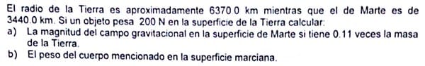 $$\begin{align}&g_p=G·\frac{M_p}{r^2_p}\\&\\&\text {donde}\\&G=6.67384·10^{-11}\frac{N·m^2}{kg^2}\\&M_p=\text{masa del planeta en kg}\\&\text{Como la de la tierra es }M_t=5.972·10^{24} kg\\&\text{La de marte es }M_m= 0.11\,·\,5.972·10^{24} kg\\&\\&r_p =\text{radio del planeta en metros}\\&r_m=3440000 m = 3.44 ·10^6 m\\&\\&g_m=6.67384·10^{-11}\frac{N·m^2}{kg^2}·\frac{ 0.11\,·\,5.972·10^{24} kg}{(3.44 ·10^6 m)^2}=\\&\\&\frac{4.384178973 \;N·m^2·kg}{1.18336·10^{13}\;kg^2·m^2}= 3.704856487 \frac{N}{kg}=\\&\\&3.704856487 \frac{kg·\frac m{s^2}}{kg}=3.704856487\; m/s^2\\&\\&\\&b)\\&\text{El campo en la superficie terrestre tierra se calcula igual,}\\&\text{puede que incluso te lo haya hecho, lo he hecho varias veces.}\\&\text{Además creo que te dejarían usar la archiconocida }g=9.8m/s^2\\&\\&g_t=6.67384·10^{-11}\frac{N·m^2}{kg^2}·\frac{5.972·10^{24} kg}{(6.37 ·10^6 m)^2}=\\&\\&9.822379847\;m/s^2\\&\\&\text{El peso es }\\&\\&P_p=m·g_p\\&\\&\text {luego en la tierra es}\\&200 = m·9.822379847\;m/s^2\\&m = \frac{200 kg \frac{m}{s^2}}{9.822379847\;\frac m{s^2}}= 20.36166419\,kg\\&\\&p_m=m·g_m= 20.36166419\,kg·3.704856487\; m/s^2=\\&\\&75.43704366N\end{align}$$Y eso es todo.