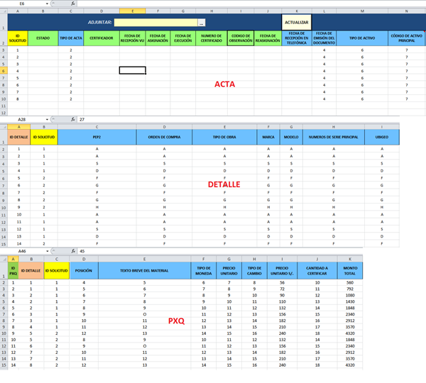En la pestaña Acta, lo que yo hago es adjuntar un archivo que es una solicitud enviada por un usuario en formato excel. Mi macro copia tal y como esta en en ese archivo de solicitud. PERO, los id de solicitud, id detalle e id PxQ no tiene los numeros correlativos que yo ya tengo en mi excel de control.