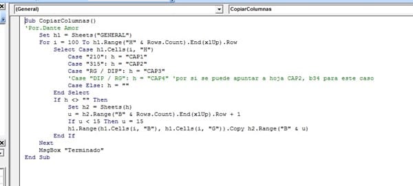 El proceso se repetiría en la fila siguiente 101 de la hoja "GENERAL" y los datos copiados en las otras hojas se fuesen incrementando en la siguiente fila 16 y así sucesivamente hasta que no hubiese datos en la columna B de la hoja "GENERAL" para copiar.
