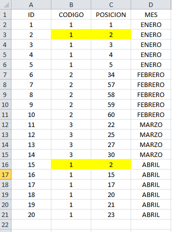 Tengo dos columnas: código y posición.