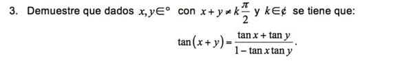 $$\begin{align}&\text{Se tiene que:}\\&\\&tan(x+y)=\frac{sen(x+y)}{\cos(x+y)}=\frac{sen(x)\cos(y)+sen(y)\cos(x)}{\cos(x)\cos(y)-sen(y)sen(x)}=\frac{\frac{sen(x)\cos(y)+sen(y)\cos(x)}{\cos(x)\cos(y)}}{\frac{\cos(x)\cos(y)-sen(y)sen(x)}{\cos(x)\cos(y)}}=\frac{\frac{sen(x)\cos(y)}{\cos(x)\cos(y)}+\frac{sen(y)\cos(x)}{\cos(x)\cos(y)}}{\frac{\cos(x)\cos(y)}{\cos(x)\cos(y)}-\frac{sen(y)sen(x)}{\cos(x)\cos(y)}}=\frac{\frac{sen(x)}{\cos(x)}+\frac{sen(y)}{\cos(y)}}{1-\frac{sen(x)sen(y)}{\cos(x)\cos(y)}}=\frac{tan(x)+tan(y)}{1-tan(x)tan(y)}\\&\end{align}$$y listo!