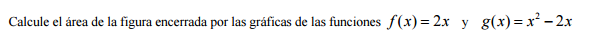 $$\begin{align}&A=\int_0^4[2x-(x^2-2x)]dx=\\&\\&\int_0^4(4x-x^2)dx=\\&\\&\left[2x^2-\frac {x^3}{3} \right]_0^4=32-\frac {64}3=\frac{32}{3}u^2\end{align}$$Y eso es todo.