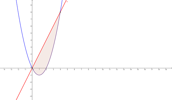 Otra duda que te puede quedar cual es la función de arriba y la de abajo en la región que determinan. Puedes calcular el valor de las funciones en un punto intermedio y así sabrás cual es la superior. Pero puedes llegar a más, la parabola tiene forma de U por ser positivo el coeficiente de x^2, luego si la recta la corta la cortará por encima entre los puntos de corte. Y poir lo tanto la función del minuendo será la recta y la del sustraendo la parábola.