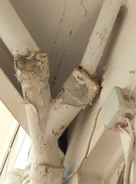 Hemos comprado una casa vieja (Años 60-80) recientemente y tiene estas bajantes de desagüe en la terraza interior, que recorre toda la pared del patio de vecinos. ¿Sabéis si se trata de uralita/fibrocemento, o es otro material? De serlo, cuál sería la mejor opción para arreglarla, ya que se ve en un estado bastante deteriorado. ¿Debería reemplazarla por una nueva de PVC o basta con ponerle algún material y pintar?