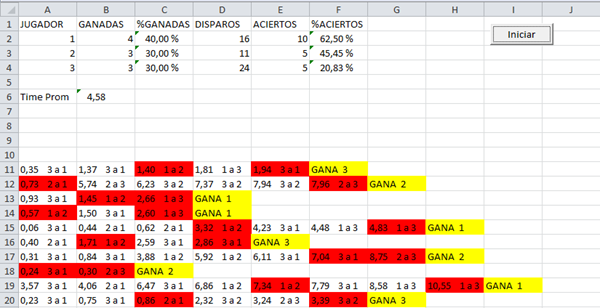 Como puedes ver he hecho que puedas elegir el número de combates, es que con 10 solo los resultados no eran nada representativos. Si manejas un poco las macros incluso puedes cambiar el número de contendientes y la probabilidad de acierto. Si cambias las probabilidades de acierto que estén en orden descendente, ya que lo que el disparador dispara al primero de la lista que está vivo, por eso has debido hacer que sea el que más probabilidad tenga entre ellos.