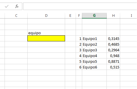 Necesito hacer un sorteo de equipos (G4:G9), pero de manera que vayan saliendo en la casilla D4, de uno en uno y no se repitan en el sorteo los que ya han salido.