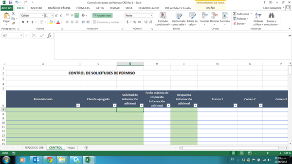 Tengo en excel un archivo para dar seguimiento a actividades, lo que quiero hacer es que si en "Respuesta información adicional" (posición H7) no hay una fecha (indicación de que ya se completó), 3 días hábiles antes de que se cumpla "Fecha máxima de respuesta información adicional" (posición I7), mande un correo en OUTLOOK a los correos en las posiciones (N7, O7, P7) y se siga con toda la lista.