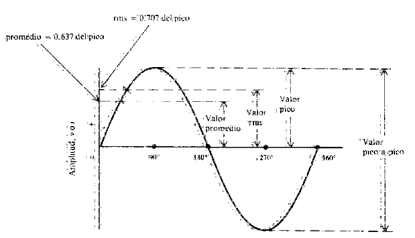 Observa también que cuando damos el valor de una onda alterna en realidad, por convenio, estamos dando el valor RMS que es un 70% más pequeño que el valor máximo o de pico. Concretamente: