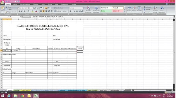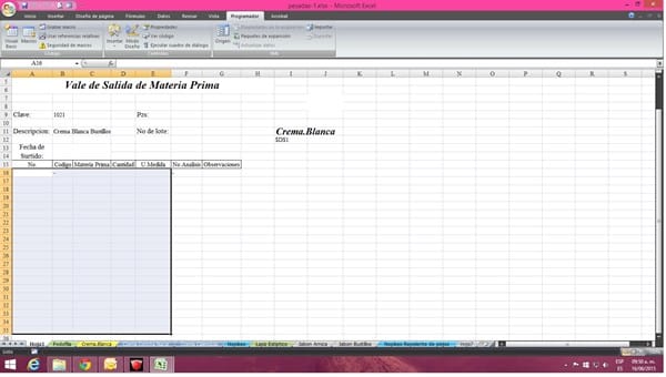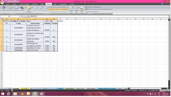y abajo se muestran las hojas que tienen las recetas de diferentes productos que muestra la base de la receta así y lo que quisiera que pegara a la hoja principal y dependería de cada receta de producto.