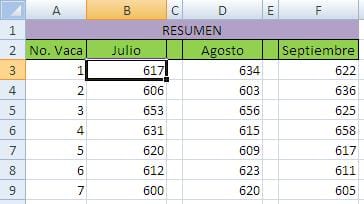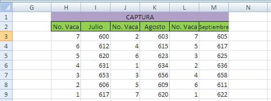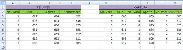 Tengo dos columnas por un lado A1 que es el numero de una vaca y A2 es el peso del mes de julio, al mes siguiente(agosto) las peso de nuevo y tomo los datos y hago otras dos columnas, en la primera estaran los datos de A1 pero desordenados con respecto a julio y en la segunda columna ya cambian los datos porque las vacas pesan mas. Como hago para colocar las cuatro columnas (dos de cada mes) y que me devuelva A1 con los pesos de ambos meses en la misma fila.