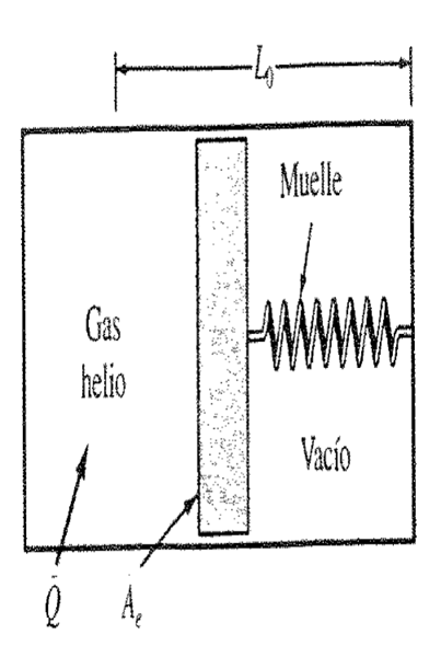Un embolo de área (A sub e) Ae=0,02 m^2 esta situado dentro de un cilindro cerrado, como se muestra en la figura. Un lado esta lleno de helio mientras que el otro contiene un muelle en el vació. Lentamente se añade calor hasta que la presión del gas cambia de 0,1 a 0,3 MPa. La constante k del muelle es 10^4 N/m. Determine: