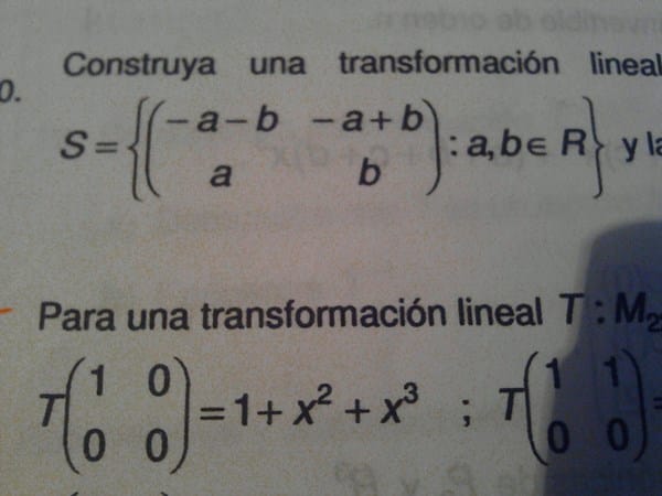 Construya una transformación lineal T: M2x2 a R^3 de manera que el núcleo de T sea S y la imagen de T sea el plano x+y-z=0.