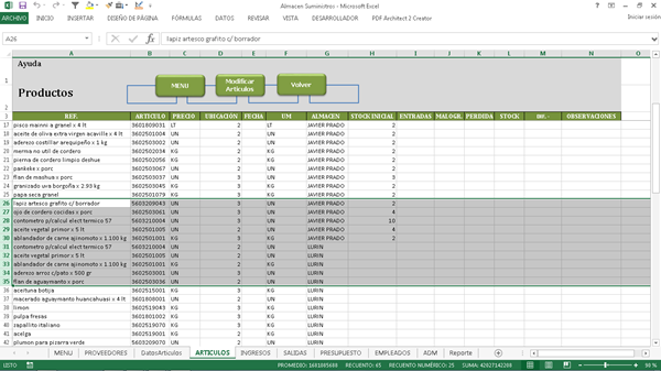 Esta es la hoja de artículos en la cuales tengo 3 tipos de almacenes con la misma cantidad de productos