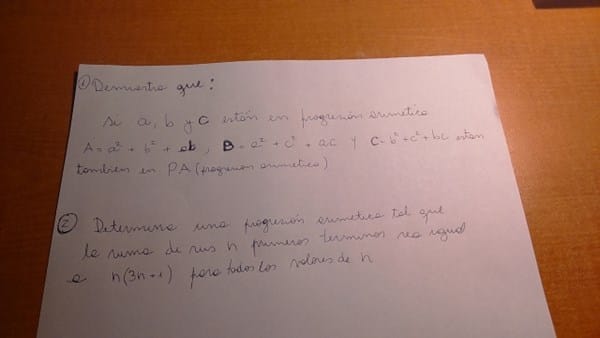 $$\begin{align}&S_n=\frac{n(a_1+a_n)}{2}\\&\\&\text{Si tenemos en cuenta que}\\&\\&a_n=a_1+(n-1)d\\&\\&S_n=\frac{n(a_1+a_1+(n-1)d)}{2}=\\&\\&\frac{n(dn+2a_1-d)}{2}=\\&\\&\frac{dn^2+(2a_1-d)n}{2}\\&\\&\text{Y esto debe ser igual a lo que nos dan para todo n}\\&\\&n(3n+1) = 3n^2+n\\&\\&luego\\&\\&\frac{dn^2+(2a_1-d)n}{2}=3n^2+n\\&\\&\text{para que el término de } n^2\text{ sea igual}\\&\\&\frac d2=3 \implies d=6\\&\\&\text{Y para que sea igual el de n}\\&\\&\frac{2a1-d}{2}=1\\&\\&\frac{2a_1-6}{2}=1\\&\\&2a_1-6=2\\&\\&2a_1=8\\&\\&a_1=4\\&\\&\text{Luego la sucesión es}\\&\\&4, 10, 16, 22, 28\\&\\&a_n=6n-2\end{align}$$