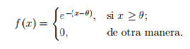 $$\begin{align}&\text{Tenemos primeramente que la finción de densidad es:}\\&\\&f(x;\theta)=e^{-(x-\theta)}\\&\ \ \ \ \ \ \ \ \ \ \ =e^{-x+\theta}\\&\ \ \ \ \ \ \ \ \ \ \ =e^{\theta-x}\\&\ \ \ \ \ \ \ \ \ \ \ =e^{\theta}*e^{-x}\ \ \ \ \ con\ \ \ x\ge \theta\end{align}$$$$\begin{align}&\text{Luego, para hallarnos el estimador de máxima verosimilitud, hallemos primero la verosimilidad, la cual se define de la siguiente forma:}\\&\\&L(\theta)=\prod_{i=1}^n f(x_{i};\theta)\\&\\&\text{Entonces:}\\&\\&L(\theta)=\prod_{i=1}^n f(x_{i};\theta)\\&\\&\ \ \ \ \ \ \ \ =e^\theta*e^{-x_{i}}\\&\\&\ \ \ \ \ \ \ \ =(e^\theta*e^{-x_{1}})*(e^\theta*e^{-x_{2}})*...*(e^\theta*e^{-x_{n}})\\&\\&\ \ \ \ \ \ \ \ =(e^\theta*e^\theta*...*e^\theta)*(e^{-x_{1}}*e^{-x_{2}}*...*e^{-x_{n}})\\&\\&\ \ \ \ \ \ \ \ =e^{n\theta}*e^{-\sum_{i=1}^n x_i}\\&\\&\\&\\&\end{align}$$$$\begin{align}&\text{Luego, saquemos logaritmo natural, entonces:}\\&\\&ln(L(\theta))=ln(e^{n\theta}*e^{-\sum_{i=1}^n x_i})\\&\ \ \ \ \ \ \ \ \ \ \ \ \ \ =ln(e^{n\theta})+ln(e^{-\sum_{i=1}^n x_i})\\&\ \ \ \ \ \ \ \ \ \ \ \ \ \ =n\theta*ln(e)+({-\sum_{i=1}^n x_i})*ln(e)\\&\ \ \ \ \ \ \ \ \ \ \ \ \ \ =n\theta\ {-\sum_{i=1}^n x_i}\\&\\&\end{align}$$$$\begin{align}&\text{Luego,derivemos parcialmente:} \ \ \ ln(L(\theta))\ \ \ \text{con respecto del parámetro}\ \ \ \theta\ \ \text{ e igualemos a cero para hacerlo máximo, entonces:}\\&\\&\frac{\partial \ ln(L(\theta))}{\partial \theta}=0\\&\\&\text{Entonces:}\\&\\&\frac{\partial \ ln(L(\theta))}{\partial \theta}=n* \frac{d\ (\theta)}{d\theta}{-\sum_{i=1}^n x_i}*\frac{d\ (1)}{d\theta}\\&\ \ \ \ \ \ \ \ \ \ \ \ \ \ \ \ \ \ \ =n-0=0\\&\\&\text{Por lo tanto: n=0}\\&\\&\text{Ahora, notemos que esta ecuación no proporciona un valor máximo ya que esa derivada no se anula. E En estas condiciones sólo queda observar que la derivada es siempre positiva, por lo que su mayor valor se obtiene cuando}\ \ \ \theta\ \ \ \text{ toma su valor máximo.}\\&\\&\text{Dado que los valores muestrales son tales que:}\ \ \ x_{i}\ge\theta\ \ con\ \ i=1,2,...,n\\&\text{entonces el estimador}\ \ \ \hat{\theta}\ \ \ \text{buscado será el valor máximo de}\ \ \ \theta\\&\\&\text{Es decir:}\\&\\&\theta _{máx} \ \ \ \text{que cumpla con ésa condición:}\ \ \ x_{i}\ge\theta\ \ con\ \ i=1,2,...,n\\&\\&\text{Por lo tanto:}\\&\\&\hat{\theta}_{máx}=máx(x_{n})\\&\\&\\&\end{align}$$y listo!