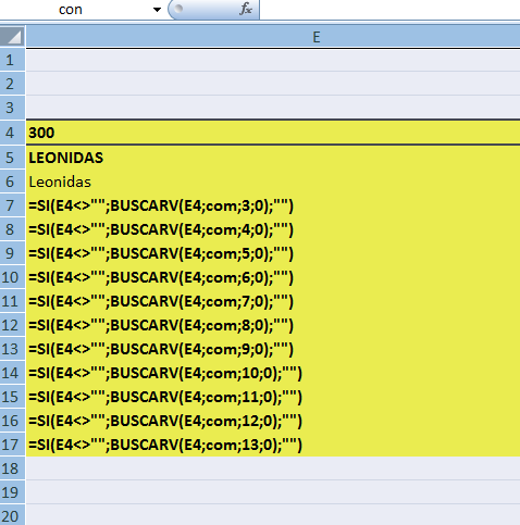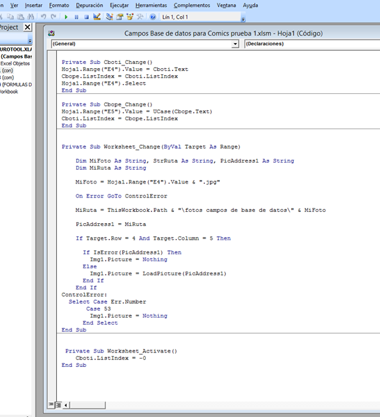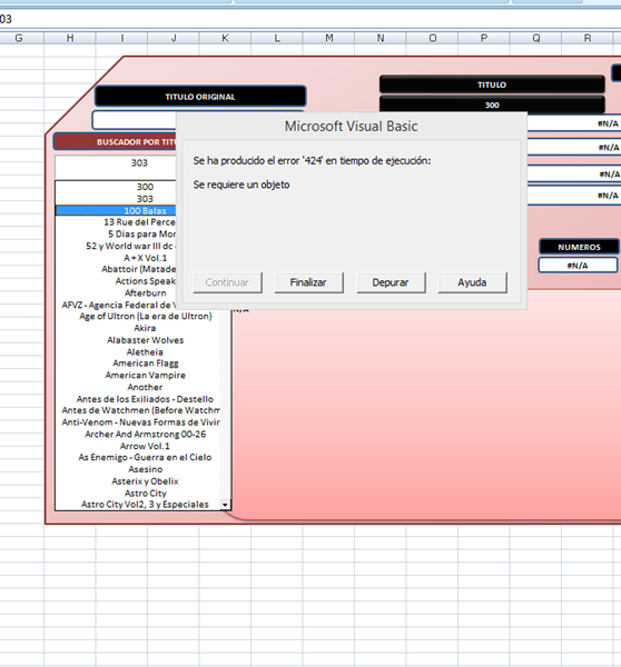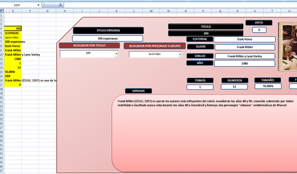 Este pantallazo es de la "hoja con" donde puedo seleccionar con los conbox por titulo o por personaje (fila A y B de la hoja com) y se completa esta especie de formulario que he copiado de la red.