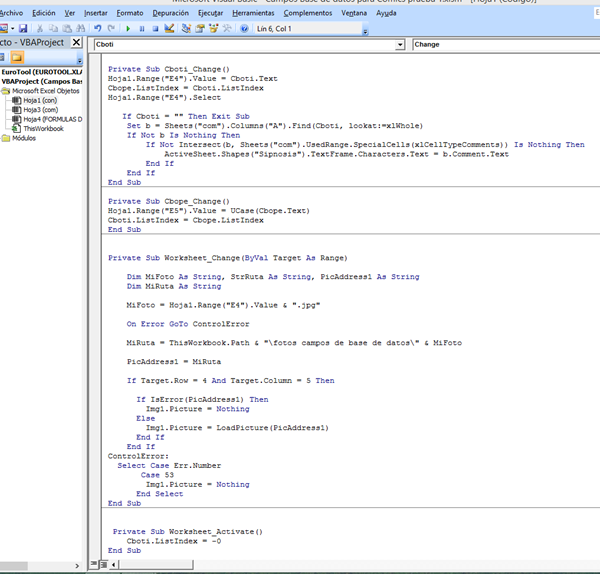La celda "E4" de esta ultima hoja me va cambiando el titulo según busco un titulo con los conbox, podría ser la referente a la hora de buscar una función (se me ocurre) y mostrar el correspondiente comentario que tiene añadido desde la "hoja com".