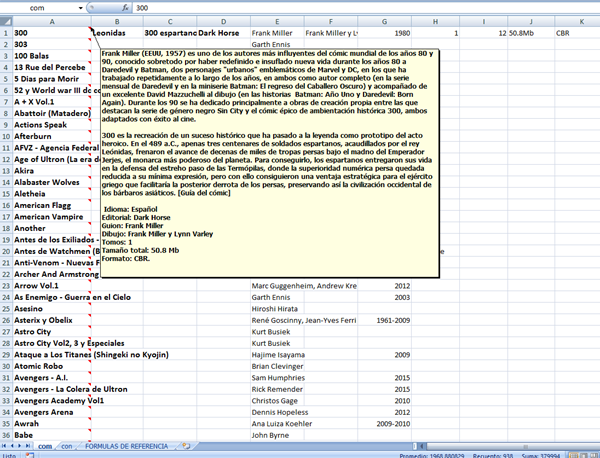 Esta es una base de datos que he ido haciendo durante mucho tiempo "hoja com". Se basaba en tres filas en las que tenia el titulo, el guionista y el año de mis cómics. Dentro de cada titulo tengo un comentario, este comentario es el que quiero ir visualizando en la otra "hoja con".
