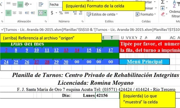 Ahora el problema que me presenta, y no sé por que. Si no cambié el formato de celda. Es que, "cuando traigo la referencia." Es decir: "='[Turnos - Lic. Aranda 06-2015.xlsm]Planillas'!$S$10 & '[Turnos - Lic. Aranda 06-2015.xlsm]Planillas'!$T$10".