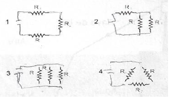 Se tienen tres resistencias iguales dispuestas en diferentes configuraciones como se ve en las figuras, alimentadas por fuentes iguales