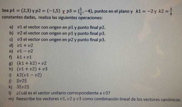 $$\begin{align}&p_1(2,3)\quad p_2(-1,5)\quad p_3 \left(\frac 12,-4 \right)\\&k_1=-2\quad k_2=\frac 13\\&\\&a)\quad v_1=p_1\to p_2 =(-1,5)-(2,3)=(-3,2)\\&\\&b)\quad v_2=p_1\to p_3= \left(\frac 12,-4 \right)-(2,3)=\left(-\frac 32,-7 \right)\\&\\&c) \quad v_3=p_2\to p_3= \left(\frac 12,-4 \right)-(-1,5)=\left(\frac 32,-9 \right)\\&\\&d)\quad v_1+v_2=(-3,2)+\left(-\frac 32,-7 \right)=\left(-\frac 92,-5 \right)\\&\\&e)\quad v_1-v_2=(-3,2)-\left(-\frac 32,-7 \right)=\left(-\frac 32,9 \right)\\&\\&f)\quad k_1·v_1=-2(-3,2) = (6,-4)\\&\\&g)\quad (k_1+k_2)·v_2=\left(-2+\frac 13\right)\left(-\frac 32,-7 \right)=\\&\qquad -\frac 53\left(-\frac 32,-7 \right)=\left(\frac 52,\frac{35}{3} \right)\\&\\&h)\quad (v_1+v_2)+v_3=\\&\qquad v_1+v_2 \text{ ya se calculó antes}\\&\qquad =\left(-\frac 92,-5 \right)+\left(\frac 32,-9 \right)=\left(-3,-14 \right)\\&\\&i)\quad k_2(v_1-v_2)=\\&\qquad v_1-v_2\text{ ya se calculó antes}\\&\qquad \frac 13\left(-\frac 32,9 \right)=\left(-\frac 12,3 \right)\\&\\&j)\quad ||v_2||= \sqrt{\frac 94+49}=\sqrt{\frac{205}{4}}=\frac{\sqrt{205}}{2}\\&\\&k) 3 ||v_2||= 3·\frac{\sqrt{205}}{2}=\frac{3 \sqrt{205}}{2}\\&\\&l)\quad \text{Unitario de }v_3. \quad v_3=\left(\frac 32,-9 \right)\\&\\&u=\left(\frac{\frac 32}{\sqrt{\frac 94+81}},\frac{-9}{\sqrt{\frac 94+81}} \right)=\left(\frac{\frac 32}{\frac{\sqrt{333}}{2}} ,\frac{-9}{\frac{\sqrt{333}}{2}} \right)=\\&\\&\left(\frac{3}{\sqrt{333}},\frac{-18}{\sqrt{333}} \right)=\left(\frac{3}{ 3·\sqrt{37}},\frac{-18}{3·\sqrt{37}} \right)=\\&\\&\left(\frac{1}{\sqrt{37}},\frac{-6}{\sqrt{37}} \right)=\left(\frac{\sqrt{37}}{37},\frac{-6 \sqrt {37}}{37} \right)\\&\\&m)\quad v_1=(-3,2)=-3(1,0)+2(0,1)\\&\qquad\; v_2=\left(-\frac 32,-7 \right)=-\frac 32(1,0)-7(0,1)\\&\qquad\; v_3=\left(\frac 32,-9 \right)=\frac 32(1,0)-9(0,1)\\&\end{align}$$Y eso es todo.