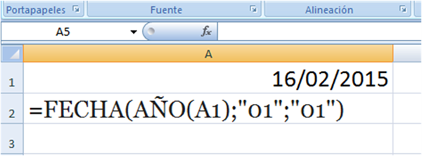 Excel, necesito que al poner una fecha cualquiera en una celda (ejemplo: 17-09-2015), me aparezca en otra celda (01-01-2015)