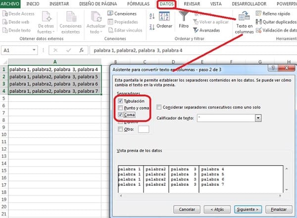 Tengo una columna donde las celdas pueden tener varias palabras separadas por una coma, por ejemplo: "palabra 1, palabra 2, palabra 3, palabra 4" y yo quisiera crear al lado de esta columna 4 columnas donde se coloquen las palabras que correspondan, por ejemplo en la columna 1 (en la fila que corresponda) "palabra 1", en la columna 2 (en la fila que corresponda) "palabra 2", en la columna 3 (en la fila que corresponda) "palabra 3" y en la columna 4 (en la fila que corresponda) "palabra 4".