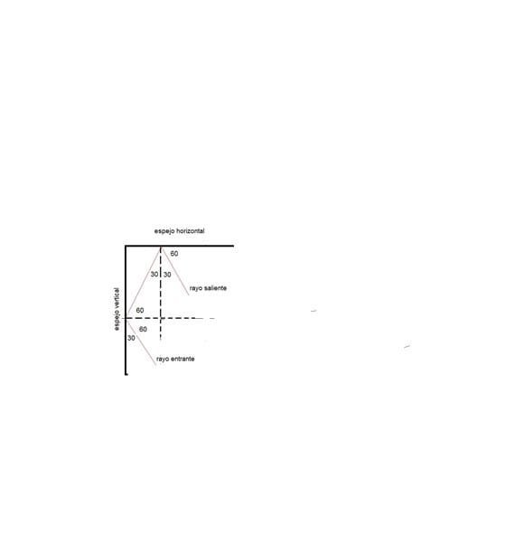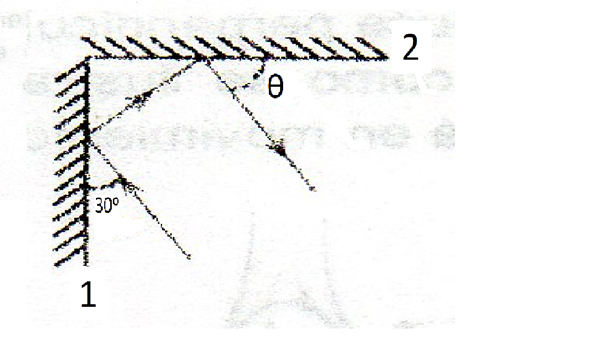 Dos espejos planos se colocan sobre una mesa formando un Angulo de 90 grados, como ilustra la figura. Un rayo luminoso incide sobre el espejo 1 formando el ángulo indicado de 30 grados. El ángulo θ que forma el rayo emergente con el espejo 2, vale (explicar):