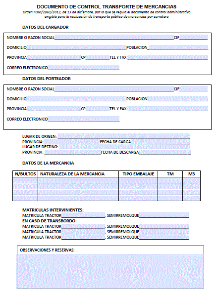 Es un documento de carácter administrativo que hay que llevar a bordo cuando se prestan servicios de transporte público bajo la autorización correspondiente. En los contratos de transporte continuado (pluralidad de envíos de forma sucesiva en el tiempo), existirán tantos documentos de control como envíos se realicen.