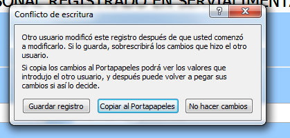 El aviso que te sale indica que estás modificando el mismo registro al mismo tiempo desde dos sitios distintos (o lo están haciendo dos usuarios al mismo tiempo, en caso de que sea multiusuario, que no lo creo)