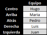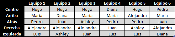Es decir, si solo están Hugo, Pedro, Juan, Luis, y María... Pedro y juan no pueden compartir el lugar de atrás, y lo único que queda libre es izquierda, y el que mejor se adapta a esa posición es Juan por tenerlo en la prioridad 2 (ya que Pedro, lo tiene en prioridad 3), así que se le asignaría a Juan ese lugar, y el grupo solamente quedaría como algo así...