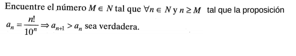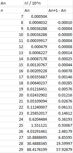 $$\begin{align}&\text{El principio de inducción dice:}\\&\text{Demostrar para P(11)}\\&\text{Si n>11, suponiendo que vale para P(n)} \to \text{vale para P(n+1)}\\&\text{tenemos dos formas de verlo, calculando: } A_{n+1} - A_n \text{ y viendo que es mayor que cero}\\&\text{o calculando } \frac{A_{n+1}}{A_n } \text{ y viendo que es mayor que 1}\\&\text{Voy a intentar de la primer forma}\\&n=11 \\&P(11) = A_{11} - A_{10} = \frac{11!}{10^{11}}-\frac{10!}{10^{10}}=0.00004>0 \to Vale!\\&P(n) \to P(n+1)?\\&A_{n+1} - A_{n}= \frac{(n+1)!}{10^{n+1}}-\frac{n!}{10^{n}}=\frac{(n+1)!-10 n!}{10^{n+1}}\\&\text{No llego a nada "útil"...intentaré el otro método}\\&P(11) = \frac{A_{11}}{A_{10}} = \frac{\frac{11!}{10^{11}}}{\frac{10!}{10^{10}}}=\frac{11}{10}=1.1>1 \to Vale! \text{ (igual ya lo sabíamos por el otro método)}\\&P(n) \to P(n+1)?\\&\frac{A_{n+1} }{ A_{n}}= \frac{\frac{(n+1)!}{10^{n+1}}}{\frac{n!}{10^{n}}}=\frac{(n+1)! 10^n}{10^{n+1}n!}=\frac{n+1}{10}\\&\text{Como n>11, vale siempre que:} \frac{n+1}{10}>1\\&\\&\\&\\&\end{align}$$