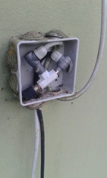 Y es que he estado haciendo una obra en mi casa. Ahora estoy con la instalaciones de TV. El problema es que de la azotea, donde está la antena, baja un cable hacia mi vivienda, la primera (edificio de dos plantas). En el registro principal, conecto la tele y se ve perfecto, de ahí va a a un registro de reparto donde tengo el repartidor, pero ahí me empieza a dar problemas.