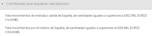 Se deben declarar los movimientos de efectivo, cheques bancarios al portador y/o de cualquier otro medio físico (oro por ejemplo), en aquellos movimientos de entrada y salida del territorio nacional por un importe igual o superior de DIEZ MIL EUROS (10.000€)