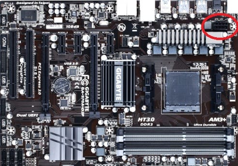 Es tambien posible que hayas olvidado conectar la alimentación auxiliar para el procesador en la placa base, es este bloque molex de ocho pines marcado en el círculo rojo, sin esa alimentación extra el equipo no podrá iniciarse.