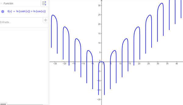 $$\begin{align}&f(x) = ln(cosh(x)) + ln(\cos(x))\\&f'(x)=\frac{1}{cosh(x)}sinh(x)+\frac{1}{\cos(x)}(-\sin(x))\\&f'(x)=tanh(x) - tan(x)\\&f'(x)=0 \to 0=tanh(x)-tan(x) \to\\&\frac{e^x+e^{-x}}{e^x-e^{-x}}=\frac{\sin(x)}{\cos(x)} \text{ (escribo las tangentes de esa forma para ver si puedo deducir algo)}\\&({e^x+e^{-x}}){\cos(x)} ={\sin(x)}({e^x-e^{-x}})\\&\text{Hagamos algunas cuentas, aunque no se si vamos a llegar a algo...}\\&e^x \cos(x)+e^{-x}\cos(x) =\sin(x)e^x-\sin(x)e^{-x}\\&e^{-x}\cos(x)+\sin(x)e^{-x} =\sin(x)e^x-e^x \cos(x)\\&e^{-x}(\cos(x)+\sin(x)) =e^x(\sin(x)-\cos(x))\\&\frac{(\cos(x)+\sin(x))}{(\sin(x)-\cos(x))} =\frac{e^x}{e^{-x}}\\&\frac{(\cos(x)+\sin(x))}{(\sin(x)-\cos(x))} \cdot \frac{(\cos(x)+\sin(x))}{(\sin(x)+\cos(x))} =(e^x)^2\\&\frac{\cos^2(x)+\sin^2(x)+2cos(x)\sin(x)}{(\sin^2(x)-\cos^2(x))} =(e^x)^2\\&\frac{1+2cos(x)\sin(x)}{(\sin^2(x)-(1-\sin^2(x))} =(e^x)^2\\&\frac{1+\sin(2x)}{(2sin^2(x)-1)} =(e^x)^2\\&\text{Y la verdad que pese a haber llegado a expresiones interesantes, no veo que sea fácil encontrar}\\&\text{el valor de x que iguala esa expresión, por lo que creo que esto no se puede resolver análiticamente, sino}\\&\text{que hay que recurrir a otros métodos como, por ejemplo, el método de Newton-Raphson}\end{align}$$Y hasta ahí pude llegar, salvo que pasemos a métodos de resolución que no sean analíticos, no encuentro la forma de resolverlo :(