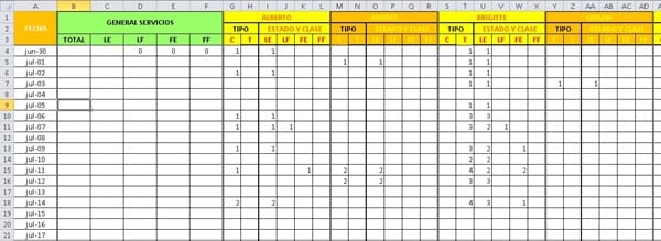 - En C4 ("General Servicios" "LE") = Suma Todas las columnas: "LE" (para el ejemplo: I4, O4, U4, AA4...) si la celda "C" de "Tipo", tiene valor. Si el valor esta en la celda "T" de "Tipo", ese valor no se debe tener en cuenta.