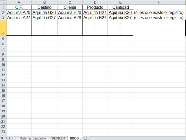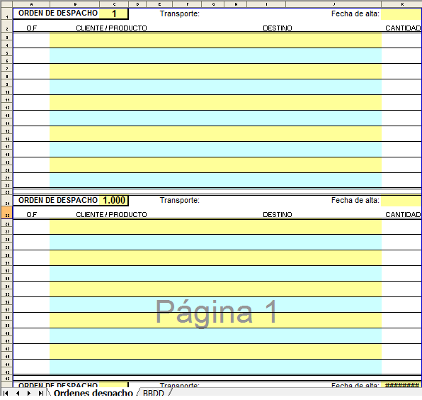 Hablando sobre el primer formulario, lo que necesito llevar sí o sí de la hoja "Ordenes despacho" a "BBDD" son las celdas (cuando tengan valores) C1, G1 y K1 y los valores que existan en el rango A3:K22. Estos datos deberían acomodarse en A2, B2, C2, D2, E2, F2, G2, H2 e ir bajando a la siguiente fila vacía de la hoja "BBDD" para el siguiente registro y así sucesivamente.