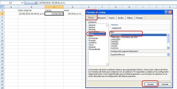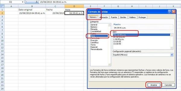 Como puedo separar este formato que esta en una celda 23/06/2015 04:39:41 a.m y la otra celda es 23/06/2015 01:01:06 p.m. Lo que quiero es sacar solo la hora que esta en ese formato y la fecha que se quede en otra celda.