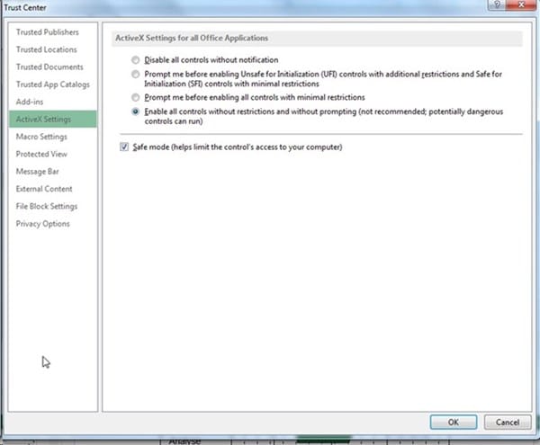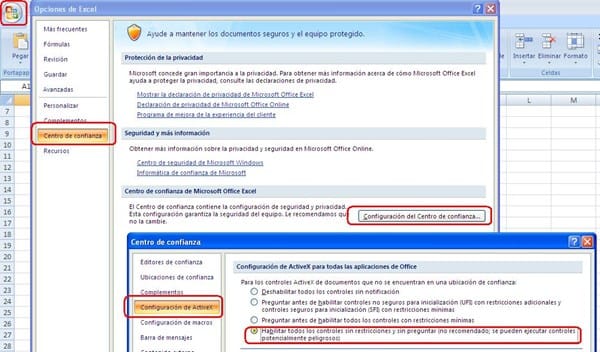 Entra a las opciones de excel, Centro de confianza, Configuración del Centro de confianza, Configuración de ActiveX y selecciona Habilitar todos los controles: