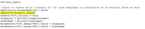 SUserName = Environ("username")Escribe en la hoja "CC" en la celda B2 el nombre de tu computadora y en la celda R1 escribe tu nombre de usuario.