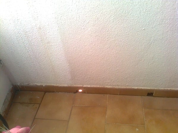 Hay que empezar eliminando, una por una, las posibles filtraciones. Para esto, necesitas empezar por la parte mas baja, que es la de los agujeros. En este apartado, necesito, que tomes una foto lo mas clara posible, del inicio del agujero hacia el exterior, donde se pueda ver, el contorno del la unión del zócalo con la pared. Lógicamente, primero hay que limpiarlo bien.