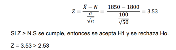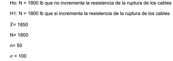 4)La resistencia a la rotura de los cables producidos por un fabricante tiene una media de 1800 libras y un desvío típico de 100 libras. Mediante una nueva técnica en el proceso de fabricación se inspira a que esta resistencia se incremente. Para ensayar esta aspiración, se obtiene una muestra de 50 cables con una resistencia media de 1850 libras. ¿Puede sostenerse que hay un aumente de la resistencia al nivel de significación del 0,01?