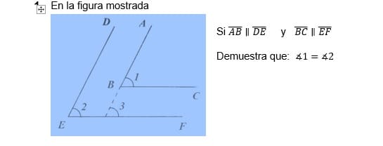 Si el segmento (AB) ∥(DE) y (BC) ∥(EF) Demuestra que: ∡1=∡2
