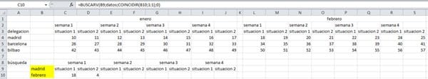 Adjunto la hoja para que se vea más claro, en ésta, el caso concreto lo que está remarcado en Amarillo son las variables mes y delegación y en function de éstas he de encontrar los datos coincidentes en semana y situación