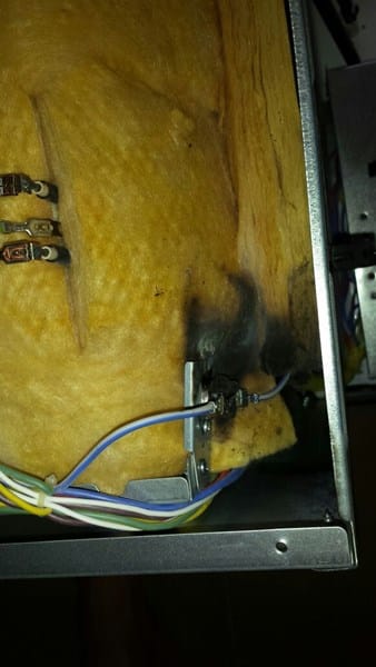 Hola, al llevar un rato en funcionamiento ha empezado a salir humo del horno y ha saltado el diferencial, al desmontar la parte trasera del horno he visto que la pieza de la foto se ha quemado dañando a su vez parte del aislamiento.