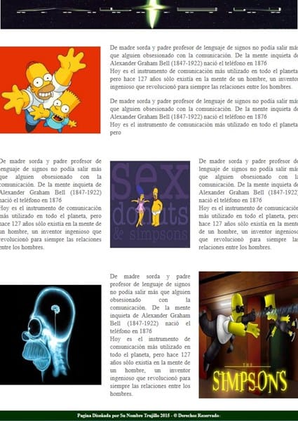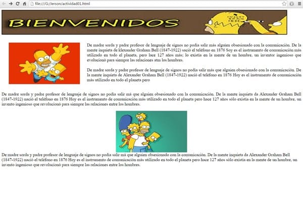 <html> <head> <title>Practica 01</title> </head> <body font ="Cambria"> <img src="images/descarga3.jpg" width="1200" height="100" align="center" border = "2"> <br> <br> <p align="Right"> <p align="justify"> <img src="images/homer_bart.jpg" width="300" height="175" align="left" hspace="30"> <font size="+1.5 pt">De madre sorda y padre profesor de lenguaje de sígnos no podía salír más alguíen obsesionado con la comunicación. De la mente inquieta de klexander Graham Bell (1847-1922) sació el teléfono en 1876 Soy es el instrumento de comunicación más utilizado en todo el planeta, pero lace 127 años más; lo existía en la mente de un hombre, un inventor ingenioso que evolucionó para siempre las relaciones atm los hombres. <br> <br> De madre sorda y padre profesor de lenguaje de signos no podía salir más que alguien obsesionado con la comunicación. De la mente inquieta de Alexander Graham Bell (1847-1922) nació el teléfono en 1876 Hoy es el instrumento de comunicación más utilizado en todo el planeta pero <br> <br> </p> </p> <p align="left"> <p align="justify"> De madre sorda y padre profesor de lenguaje de signos no podía salir má que alguien obsesionado con la comunicación. De la mente inquieta da Alexander Graham Bell (1847-1922) nació el teléfono en 1876 Hoy es el instrumento de comunicación más utilizado en todo el planeta pero hace 127 años sólo existía en la mente de un hombre, un invento ingenioso que revolucionó para siempre las relaciones entre los hombres. </p> </p> <p align="right"> <p align="justify"> <div align="center"><img src="images/imagecenter.jpg" width="300" height="175"></div> De madre sorda y padre profesor de lenguaje de signos no podía salir má que alguien obsesionado con la comunicación. De la mente inquieta da Alexander Graham Bell (1847-1922) nació el teléfono en 1876 Hoy es el instrumento de comunicación más utilizado en todo el planeta pero hace 127 años sólo existía en la mente de un hombre, un invento ingenioso que revolucionó para siempre las relaciones entre los hombres. </font> </p> </p> </body> </html>