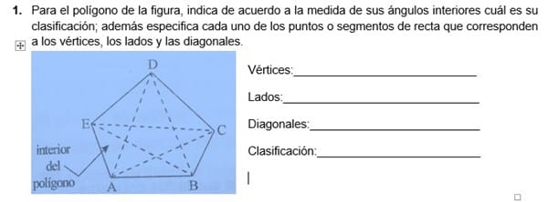 Para el polígono de la figura, indica de acuerdo a la medida de sus ángulos interiores cuál es su clasificación; además especifica cada uno de los puntos o segmentos de recta que corresponden a los vértices, los lados y las diagonales.