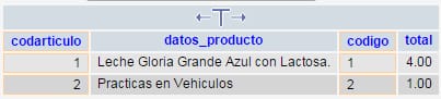 where factulinea.codigo=articulos.codarticulo and articulos.codarticulo=eefactulinea.codigo GROUP BY articulos.codarticulo" ) ;